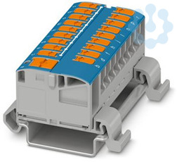 Verteilerblock, Nennspannung: 690 V, Nennstrom: 24 A, Anzahl der Anschlüsse: 19, Polzahl: 1, Anschlussart: Push-in-Anschluss, Bemessungsquerschnitt: 2,5 mm², Abgriff, Querschnitt: 0,14 mm² - 4 mm², Sammelanschluss, Bemessungsquerschnitt: 6 mm², Querschnitt: 0,5 mm² - 10 mm², Montageart: NS 35/7,5, NS 35/15, Farbe: blau