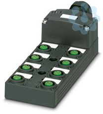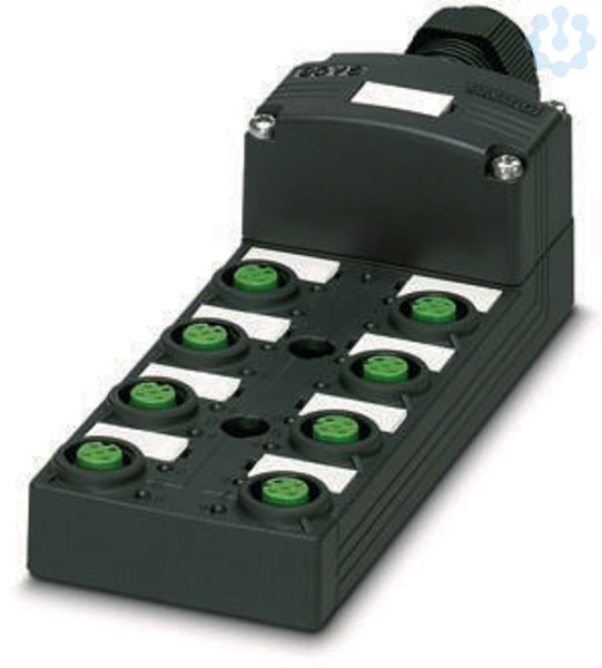Verteilerbox, Anwendung: Standard, Anschlussart: M12-Buchse Kunststoff, Anzahl der Steckplätze: 8, Polzahl: 5, Kodierung: A, Steckplatzbelegung: doppelt, Statusanzeige: ja, PNP; Stammleitungsanschluss: Push-in- / Zugfederanschluss 180°, Schirmung: nein