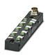 Verteilerbox, Anwendung: Standard, Anschlussart: M8-Buchse Metall, Anzahl der Steckplätze: 8, Polzahl: 3, Kodierung: A, Steckplatzbelegung: einfach, Statusanzeige: ja, PNP; Stammleitungsanschluss: M16-Steckanschluss 90°, Schirmung: nein