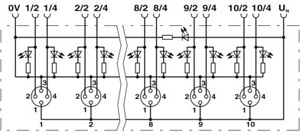 Verteilerbox, Anwendung: Standard, Anschlussart: M8-Buchse Metall, Anzahl der Steckplätze: 8, Polzahl: 4, Kodierung: A, Steckplatzbelegung: doppelt, Statusanzeige: ja, PNP; Stammleitungsanschluss: Festanschluss 180°, PUR/PVC, Leitungslänge: 10 m, Schirmung: nein