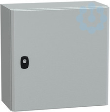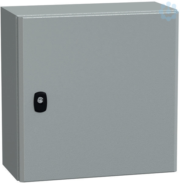 Spacial S3D Wandgehäuse aus Stahl mit glatter Tür. Einteiliges Gehäuse, inkl. Montageplatte. 3 mm Doppelstabschloss-Einsatz. Aus Stahl, Epoxid-Polyester-Pulverlackierung. Schutzart IP 66, IK10, Grau RAL 7035.
