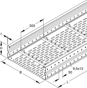 Weitspannkabelrinne, nach DIN EN 61537, mit durchgehend gelochten und gesickten Seitenholmen, sowie eingenietetem Boden mit versetzt angeordneter Perforation und gelochten Quersicken zur Stabilisierung und Trennstegbefestigung, einschließlich einer Stoßstellenleiste RSL... und anteilmäßigem Befestigungszubehör. Stoßstellenverbinder WSV 150.500 bitte gesondert bestellen. Abmessungen (ca. Maße) H x B : 150 x 600 mm Materialstärke : 1,5 mm Quersickenabstand : 300 mm Seitenholmlochung : 9,5 x 13 mm Lochabstand : 50 mm Lieferlänge : 6000 mm Nutzbarer Querschnitt : 77995 mm² Werkstoff : Stahl, bandverzinkt nach DIN EN 10346